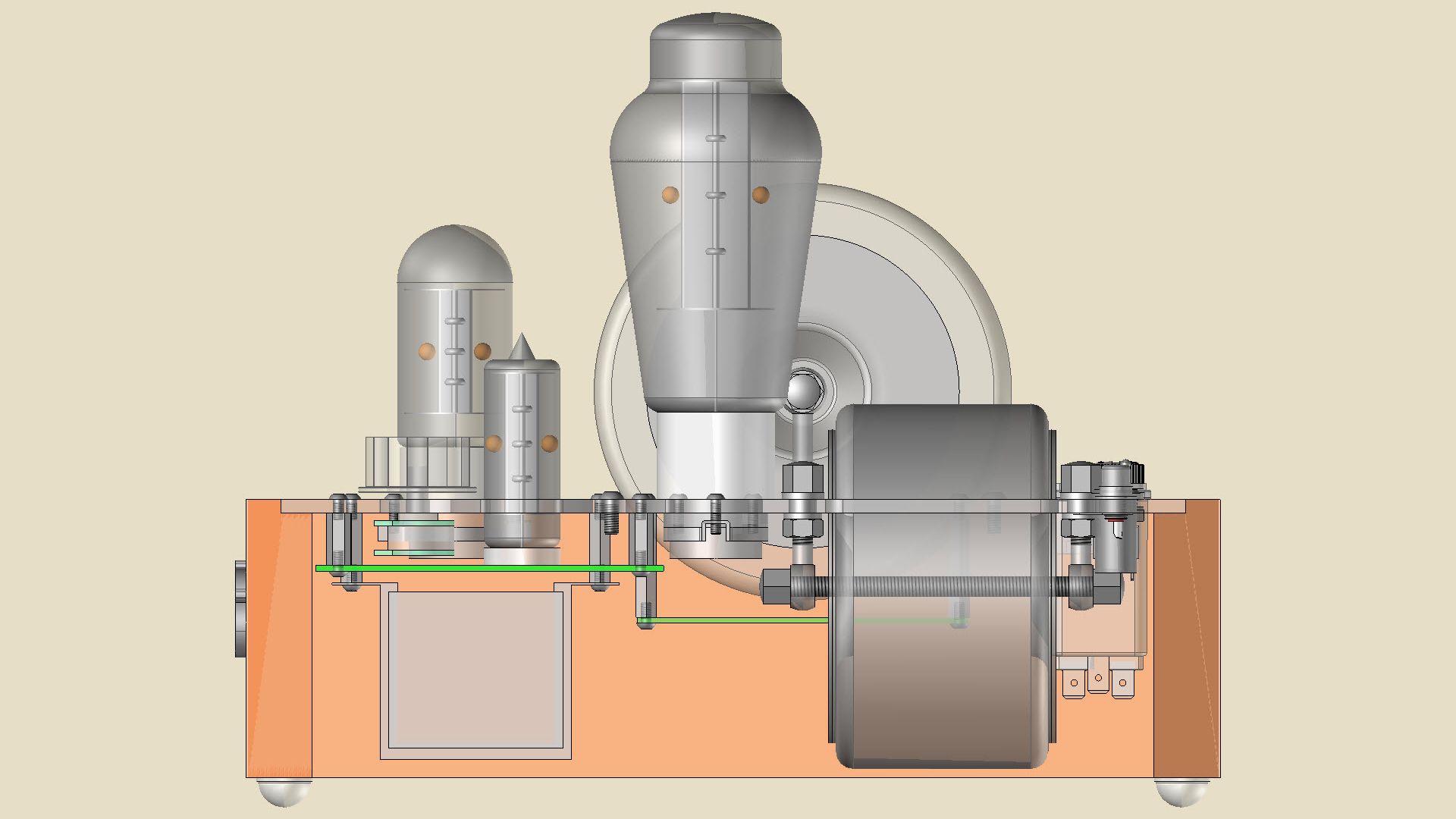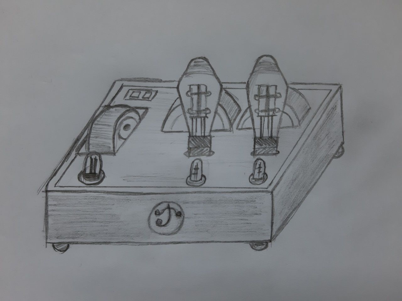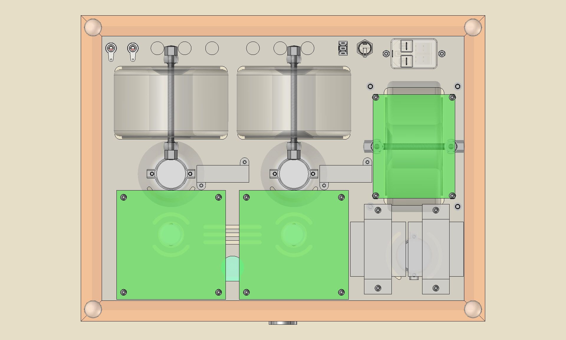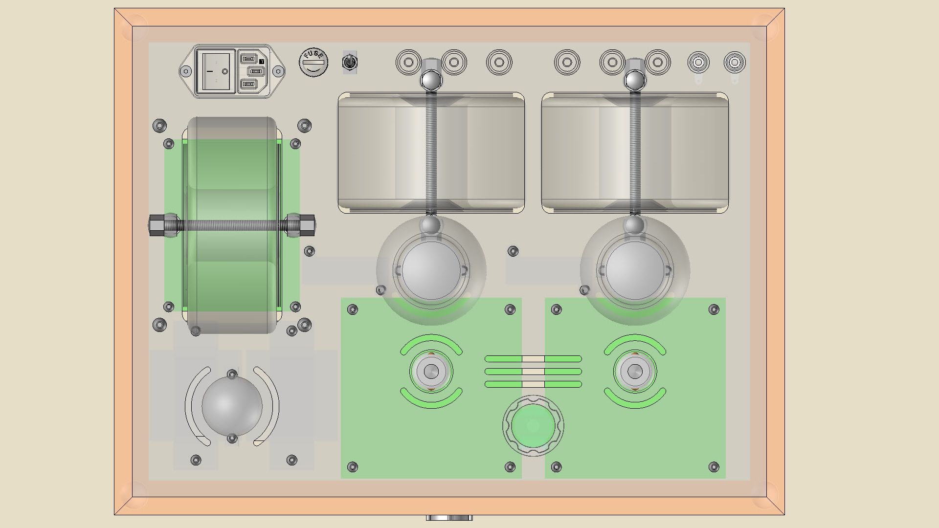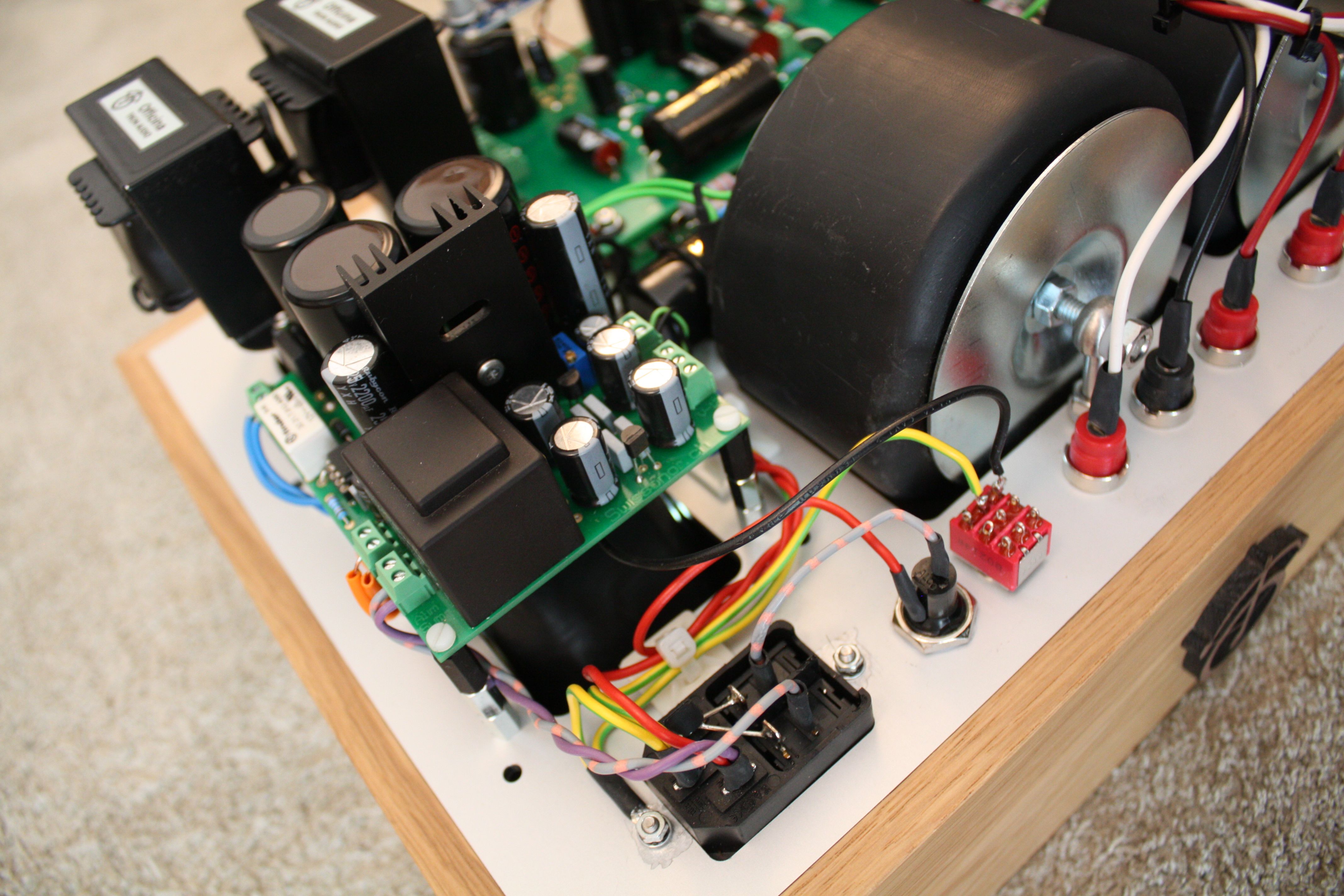 Le circuit employé pour cet appareil est notre Pilote mû follower. Cette carte comprend également une section indépendante et spécifique dédiée à l'alimentation régulée et à basse impédance de la triode de puissance. Elle est précédée d'un atténuateur à résistances commutées pour le réglage du volume.