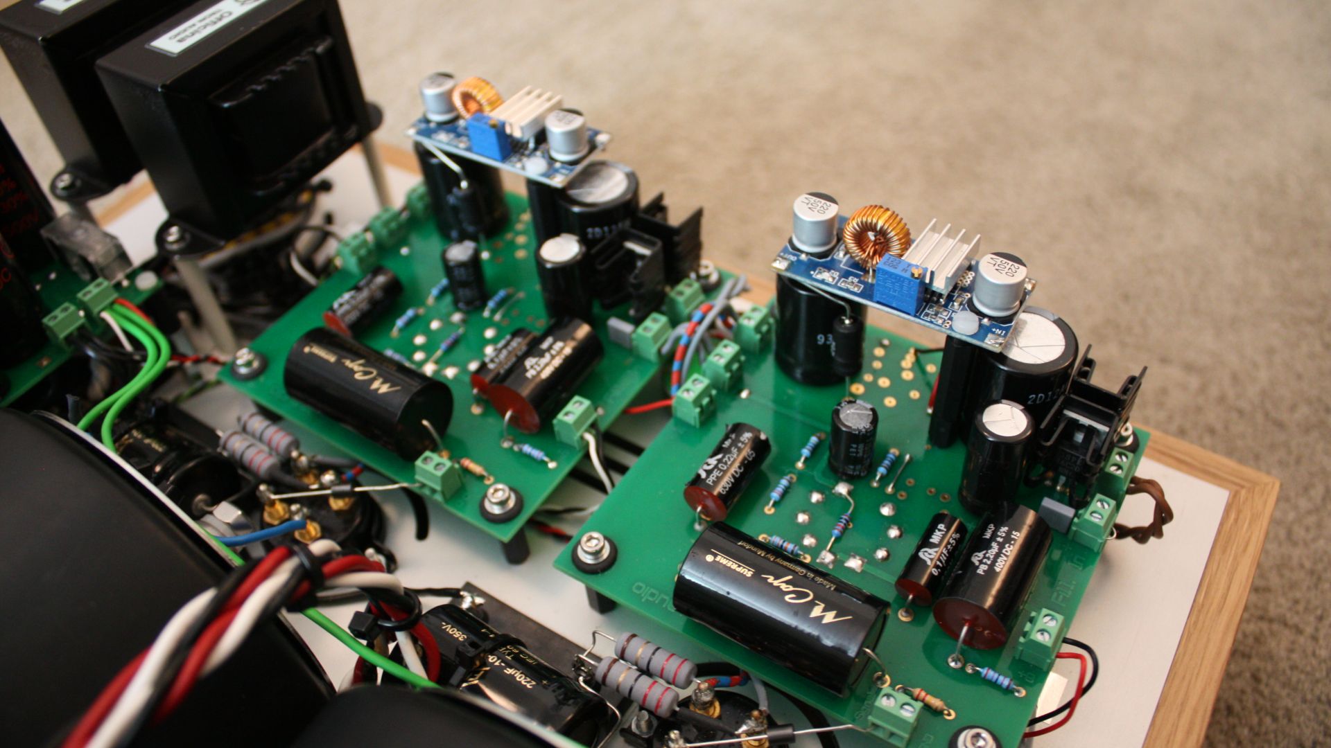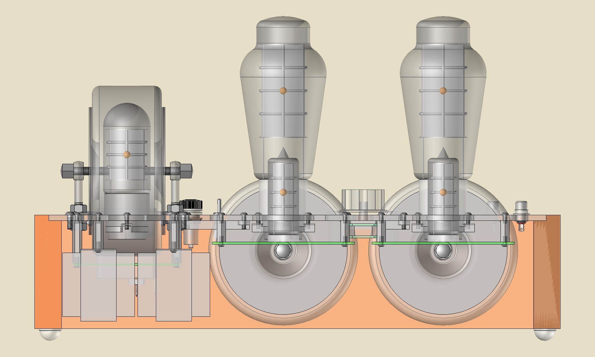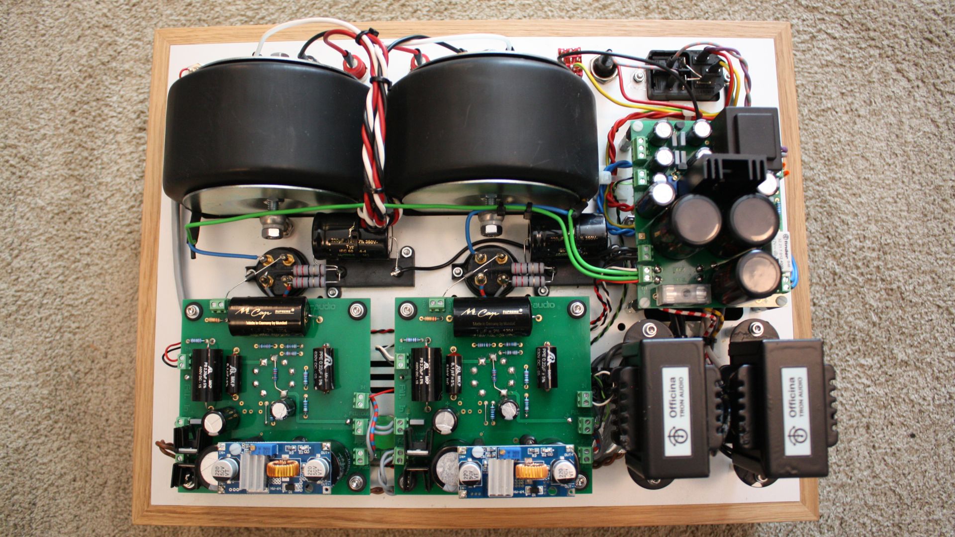 Le circuit employé pour cet appareil est notre Pilote mû follower. Cette carte comprend également une section indépendante et spécifique dédiée à l'alimentation régulée et à basse impédance de la triode de puissance. Elle est précédée d'un atténuateur à résistances commutées pour le réglage du volume.