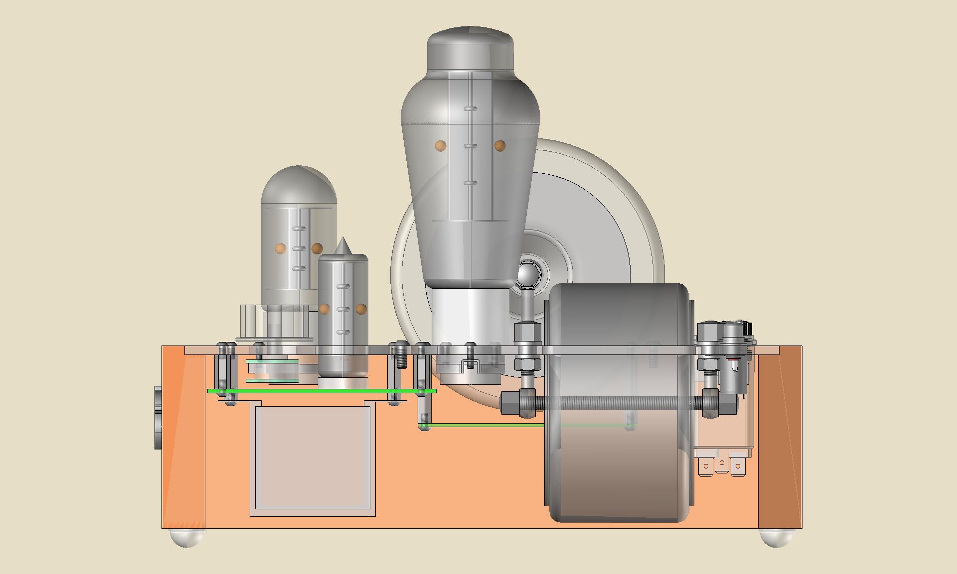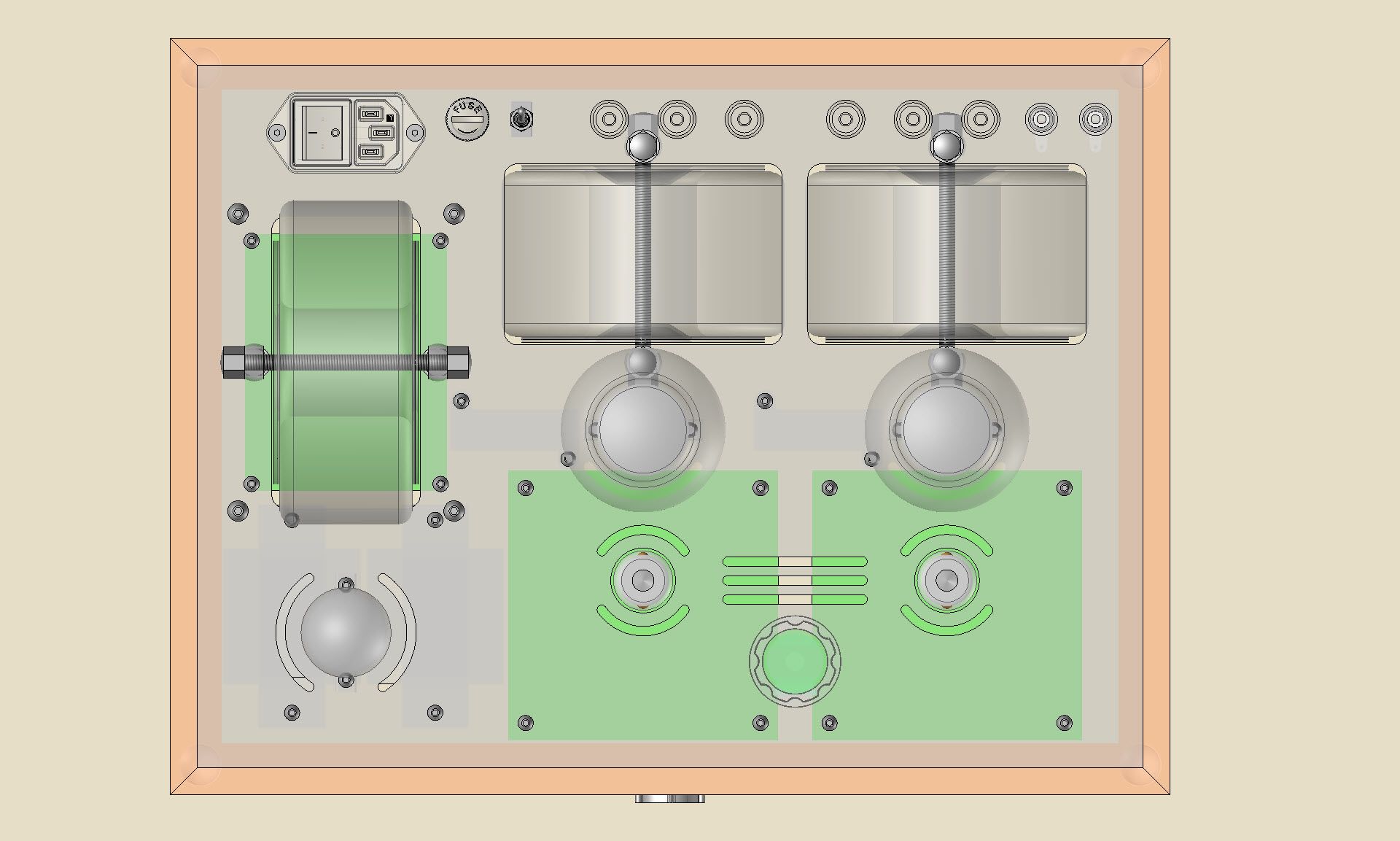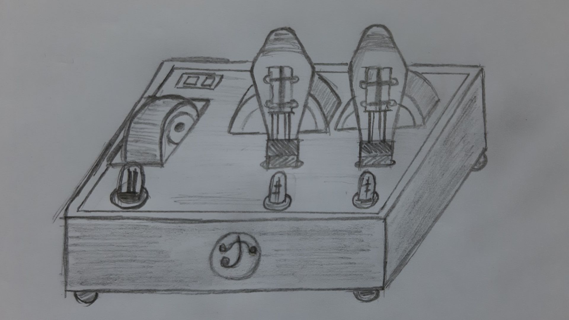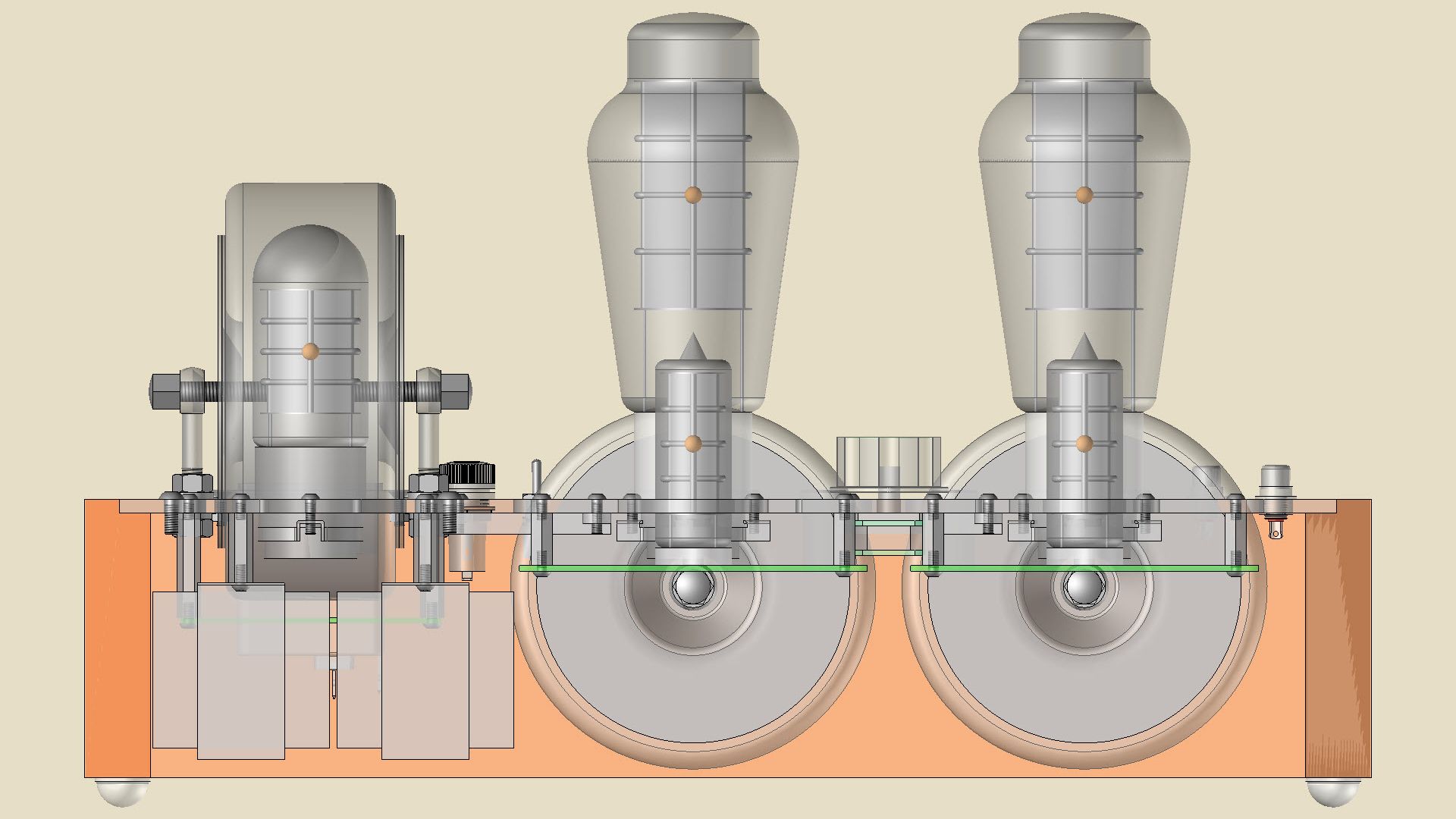 Le circuit employé pour cet appareil est notre Pilote mû follower. Cette carte comprend également une section indépendante et spécifique dédiée à l'alimentation régulée et à basse impédance de la triode de puissance. Elle est précédée d'un atténuateur à résistances commutées pour le réglage du volume.