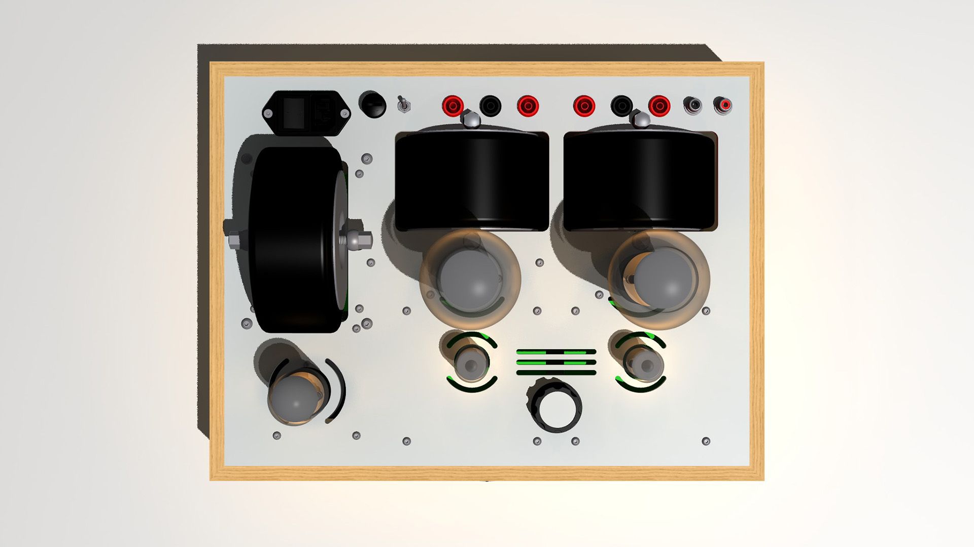 Autre particularité de notre amplificateur, son alimentation. Dans se rôle nous avons employé notre carte d'alimentation UMCP spécifiquement dimensionnée suivie en tampon d'une valve de type GZ34. Viens ensuite un filtrage énergique de type CLC sur chaque canal garantissant un découplage G/D des plus efficace.