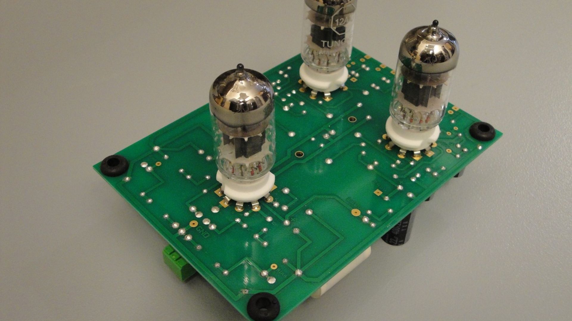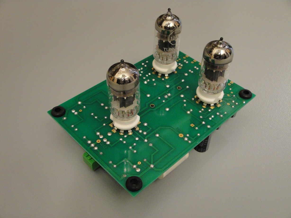 Notre carte phono est directement inspirée du circuit Marantz 7C. Très compacte son circuit offre deux étages de pré amplification et une sortie cathode follower. Ainsi constitué l'ensemble réalise un étage phono MM stéréo complet. Le circuit de correction RIAA est actif est nous avons souhaité le rendre indépendant pour par exemple appliquer facilement d'autres courbes de corrections selon les disques vinyles.