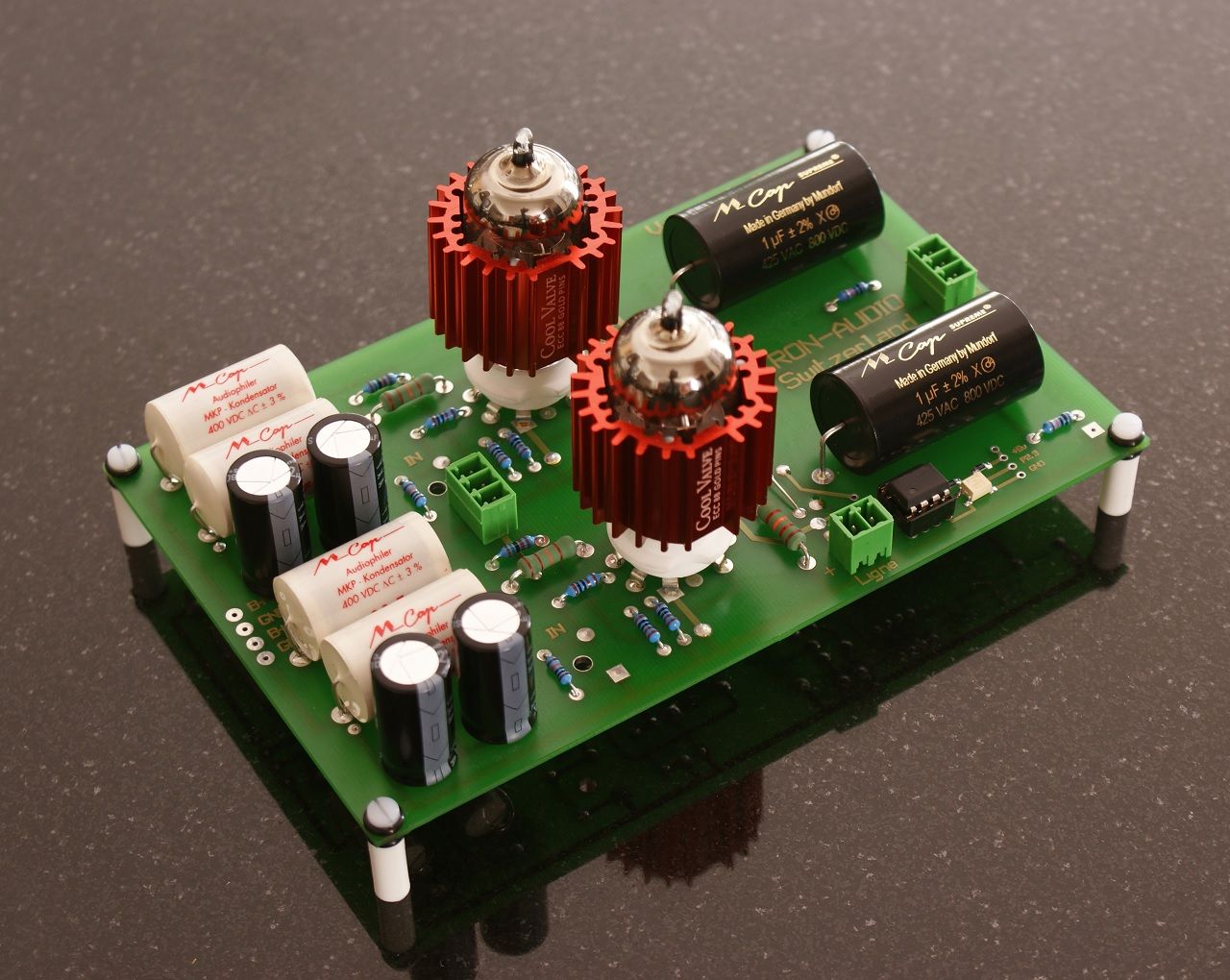 Pour ce préamplificateur ligne nous avons exploité une configuration de type cathode follower avec un couplage direct. Cet arrangement ainsi que la mise en oeuvre du circuit offre de bonnes caractéristiques techniques et fournit d'excellents résultats sonores.